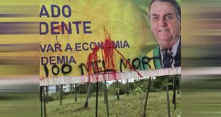 Manifestantes da esquerda jogaram tinta vermelha em um outdoor, atacando com tinta da cor de sangue, e escreveram em preto as palavras ”100 mil mortos”. Outdoors estão sendo pichados em protesto contra o presidente (Foto: Reprodução) Outdoors em favor do presidente Jair Bolsonaro estão sendo pichados e atacados em João ...