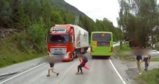 Um caminhoneiro evitou uma tragédia por uma questão de centímetros, em Oslo, na Noruega. Um vídeo que circula pelas redes sociais mostra quando jovens descem de um ônibus escolar e tentam atravessar a estrada sem perceber que um caminhão se aproxima no sentido contrário da via expressa. Uma menina ...