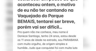 A cantora Danieze Santiago revelou, nas redes sociais, o motivo de não ter feito o show no Parque Bemais, na região metropolitana de João Pessoa, na madrugada deste domingo (21). Ela revelou que teve de andar 4km a pé, enfrentou horas de trânsito e foi impedida de fazer seu show, ...