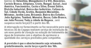 A CAGEPA comunica que o abastecimento de água nos bairros de João Pessoa, Cabedelo e toda cidade de Bayeux será suspenso nesta terça feira dia 27/09/2016 aparti das 8hs da manhã e retornará as 16:00 hs da tarde. Os bairros que vão faltar água amanhã em JOÃO PESSOA são. Valentina, ...