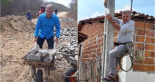Em ano eleitoral, prefeito sobe em poste para trocar iluminação e vira até calceteiro