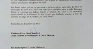 Leiam a decisão da Juíza Flavia da Costa Lins Cavalcanti Juíza Flávia da Costa Lins Cavalcanti do TRE de Santa Rita, emite parecer e não proclama Emerson Panta (PSDB) como vencedor do do pleito para Prefeito em Santa Rita. Segundo a juíza o candidato Emerson Panta está sub judice e ...