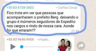 Na noite desta quarta-feira (15), o secretário adjunto de finanças Carlos César usou de redes sociais para fazer duras críticas a forma prefeito Berg Lima trata seus alidos. “Fico trste em ver que pessoas que acompanharam o prefeito Berg deixando o grupo é inúmeros seguidores de Expedito nos cargos e ...