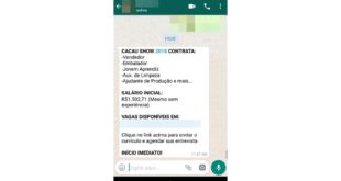Mais de 1 milhão de pessoas já acessaram o link malicioso, de acordo com a especialista em segurança digital PSafe. Um novo golpe no WhatsApp usa o nome da marca de chocolates Cacau Show para oferecer vagas de emprego. O problema é que as supostas oportunidades são falsas e, segundo informações do ...