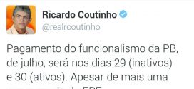 O governador Ricardo Coutinho (PSB) anunciou na tarde desta quinta-feira (28), através das redes sociais, o pagamento dos servidores públicos estaduais referente ao mês de julho. Nesta sexta-feira (29, recebem os aposentados e pensionistas. No sábado (30), os servidores da ativa. Ricardo destacou que apesar da queda na arrecadação, o ...