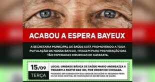 A Secretaria de Saúde de Bayeux dará início nesta terça-feira (15), a triagem de pessoas a partir de 55 anos para cirurgias de catarata, que será realizado ainda neste mês de setembro. O mutirão vai começar pelo bairro Mario Andreaza na unidade de saúde local. A meta é fazer 100 ...